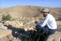 In Exodus 24:4, the Bible records that Moses "arose early in the morning, and built an altar at the foot of the mountain with twelve pillars for the twelve tribes of Israel" (NASB). There is a bamah or high place at Yeroham which suits the biblical account very well. It is located on a spur of Mt. Yeroham overlooking the plain. All that remains of it today is a rock wall surrounding the crest of the spur, and some cupmarks in the bedrock surface which outcrops within the ring of stones. The bamah wall is visible in the background of this photo of Dr. Aardsma at Mt. Yeroham. The Bamah at Mt. Yeroham lends strong support to the identification of this mountain with the biblical Mt. Sinai.
