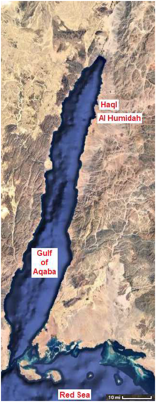 The coastal plain running along the northeast side of the Gulf of Aqaba is widest at Haql and Al Humidah, providing sufficient room for such a campsite (Figure 6). I suggest that the Israelite encampment was centered on the wadi which empties into the Gulf of Aqaba at Haql, just as we have previously seen was the case for the encampment at Etham.[12]