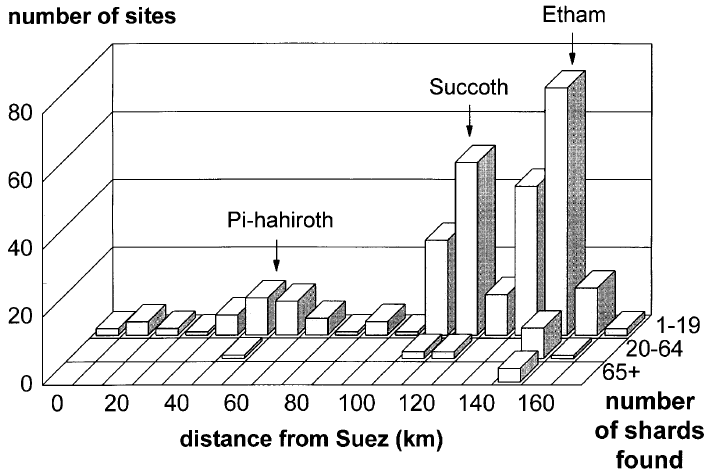 I suggest that these three clusters correspond to the first three encampments of the Israelites. The one in the middle corresponds to the first encampment at Succoth, the one on the right to the second encampment at Etham, and the one on the left to the third encampment at Pi-hahiroth.